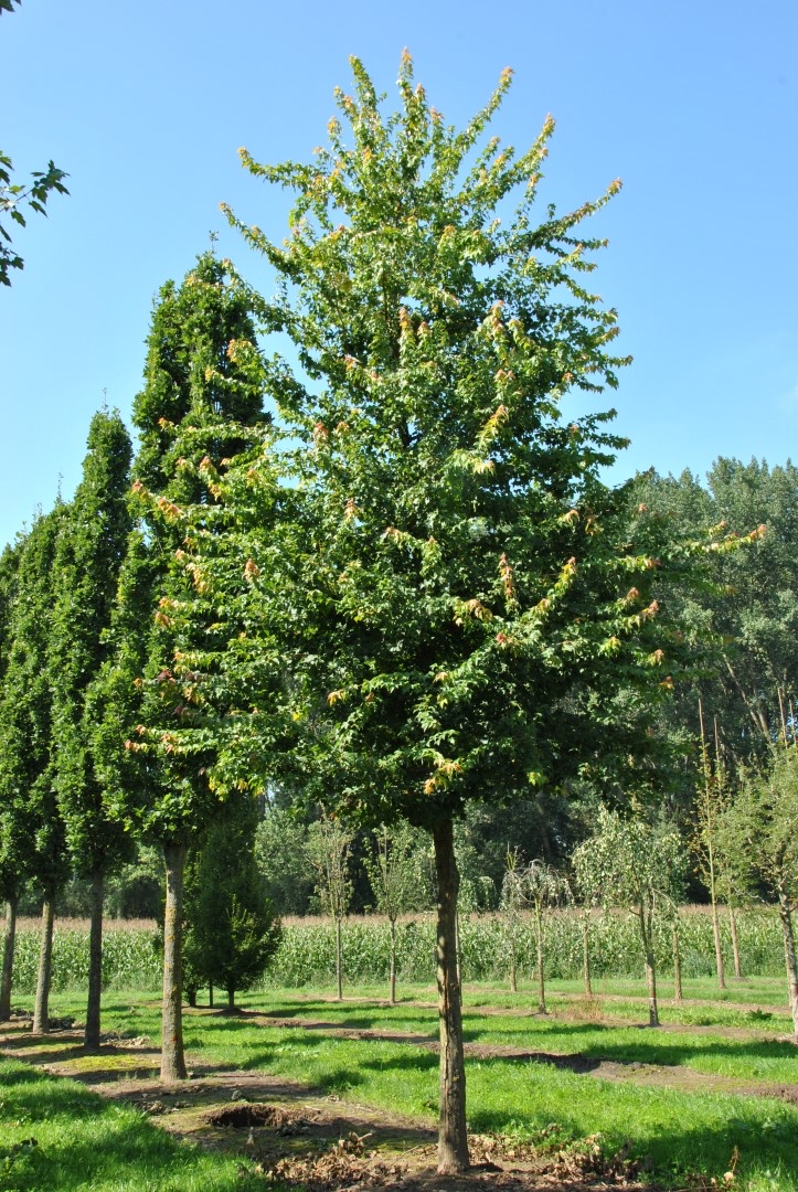 Dreispitz-Ahorn mit kompakter, harmonischer Krone und auffälliger scharlachroter bis tiefroter Herbstfärbung.